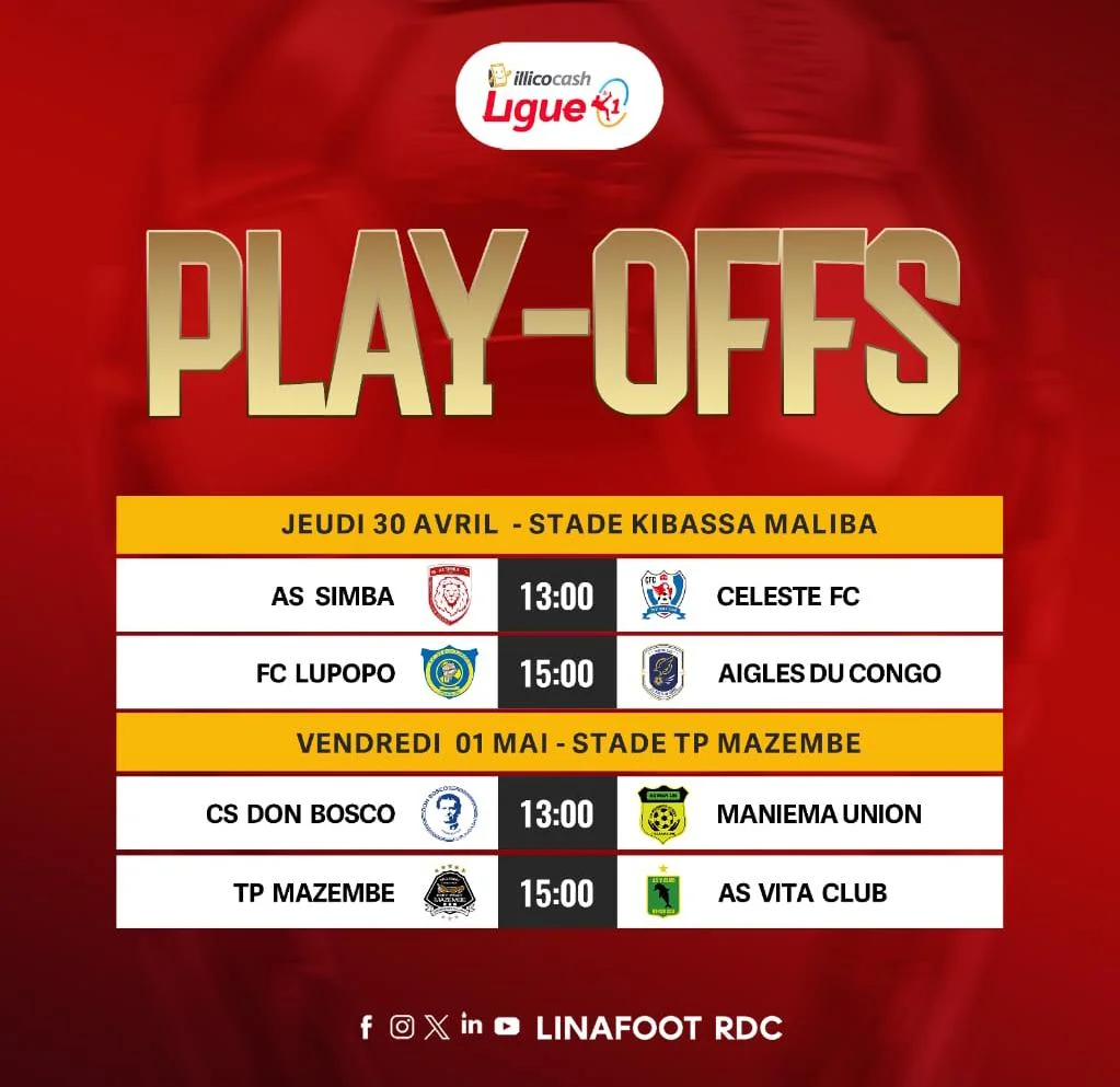 On n’attendait plus que le go pour l’ultime phase du championnat national de la RDC, les play-offs de Illico cash Ligue 1 où se retrouve finalement, la crème du football national. On commence par les stades de Lubumbashi pour les matchs de la 14ème journée avec les 8 clubs restés en course pour les trois places qualificatives aux Interclubs de la CAF et un seul champion. Pour cette phase finale de la saison, elle débute donc officiellement à Lubumbashi au stade TP Mazembe le jeudi 30.04 au stade Frédéric Kibassa Maliba avec les deux matchs : AS Simba vs Céleste FC (13H30) et FC Lupopo vs Les Aigles du Congo (15H30) pour se poursuivre le vendredi 01.05 à Lubumbashi toujours, mais cette fois-ci au stade TP Mazembe avec CS Don Bosco vs AS Maniema Union (13H30) et le classico TP Mazembe vs AS Vita Club (15H30).